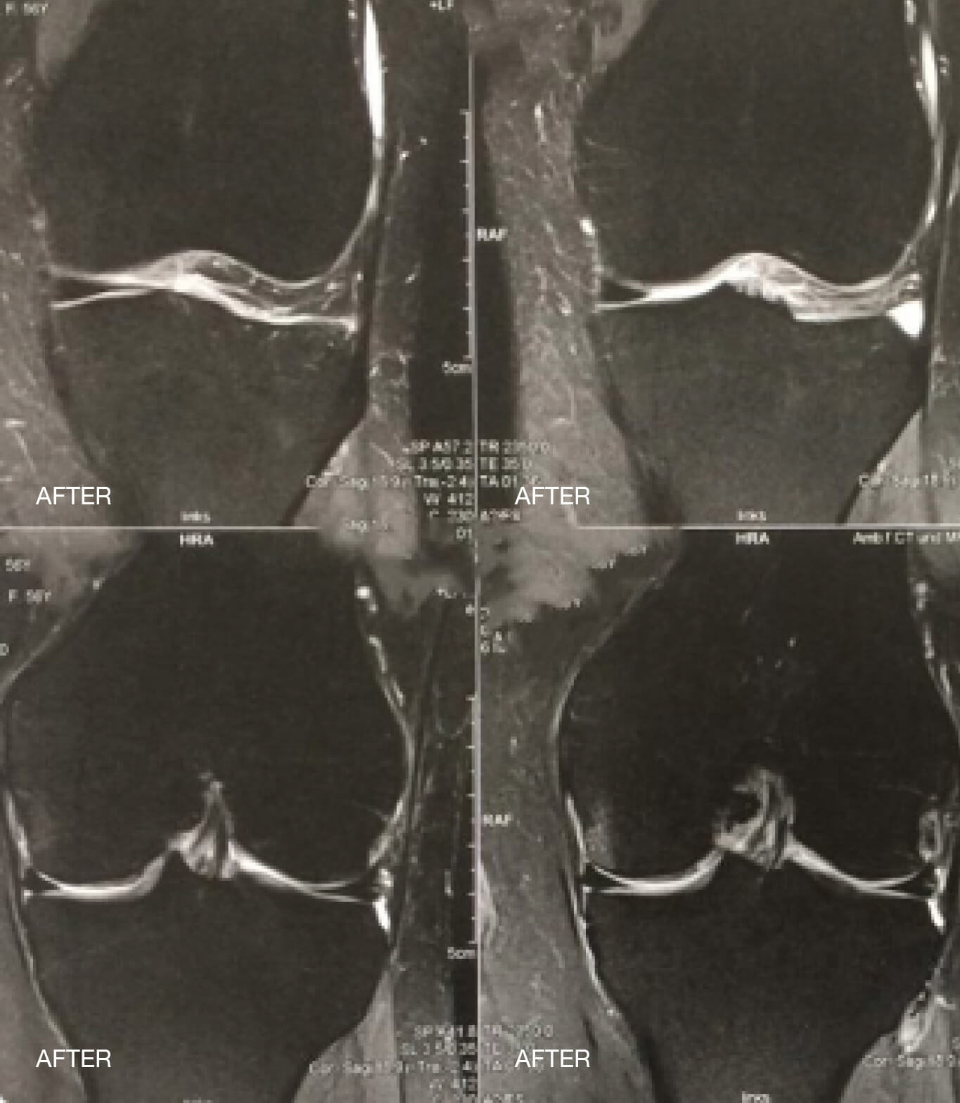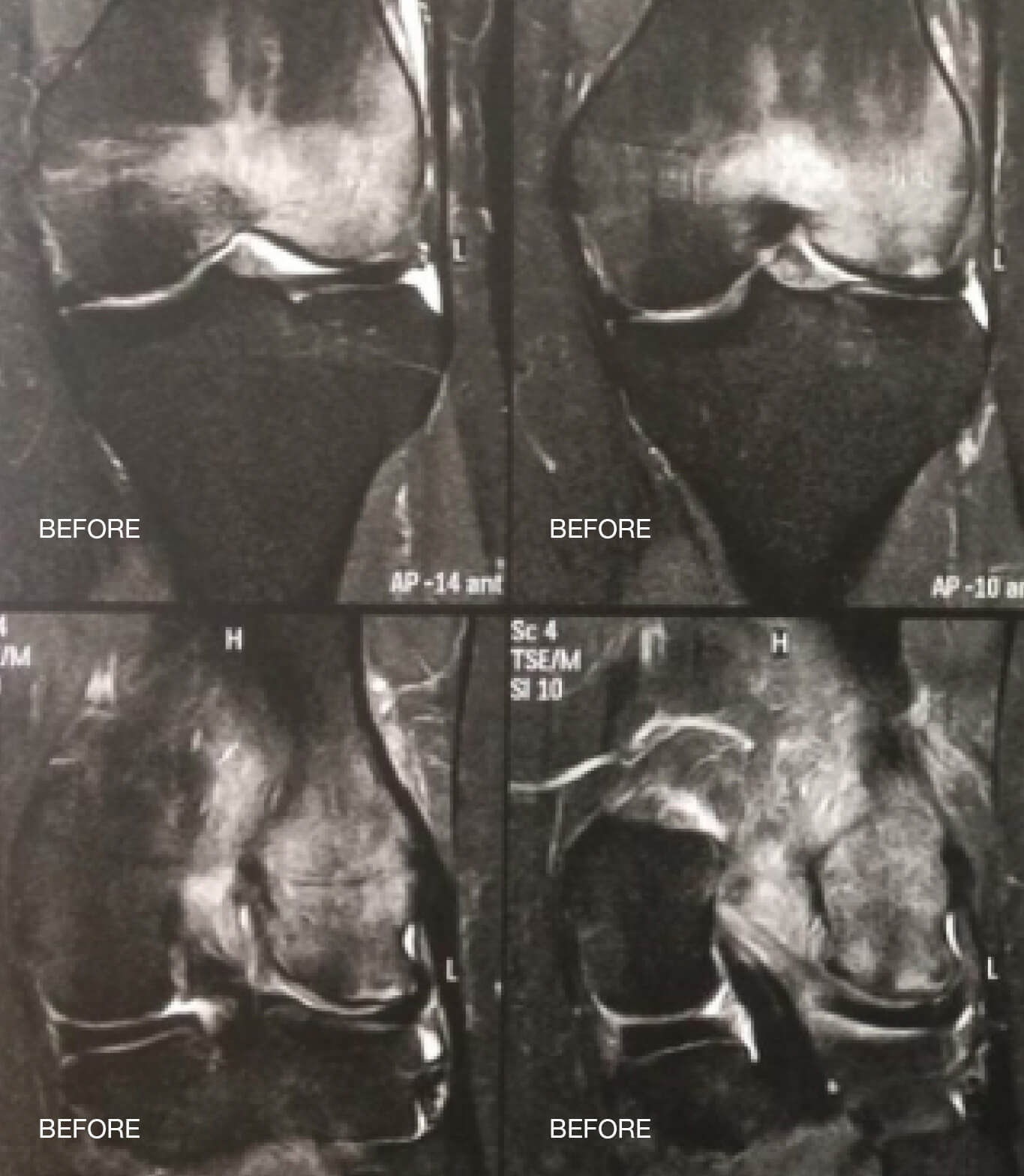 Οι ακόλουθες εικόνες απεικονίζουν ένα οίδημα μυελού των οστών στην άρθρωση του γόνατος πριν και μετά τη θεραπεία papimi. Η θεραπεία ήταν επιτυχής μετά από μόλις 10 συνεδρίες.